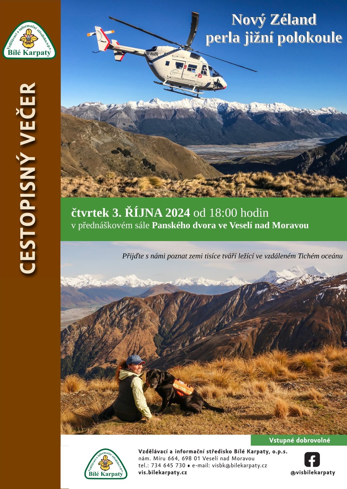 Říjnový cestopisný večer bude o životě a cestování na Novém Zélandu. Přednášející se podělí o své zážitky z průvodcování, práci v záchranářském týmu a život v krásné přírodě na Novém Zélandu. V rámci večera si také můžete prohlédnout vystavené fotografie novozélandské přírody. Průvodci po Novém Zélandu nám budou Vlaďka a Víťa Vintrovi. 👀👣