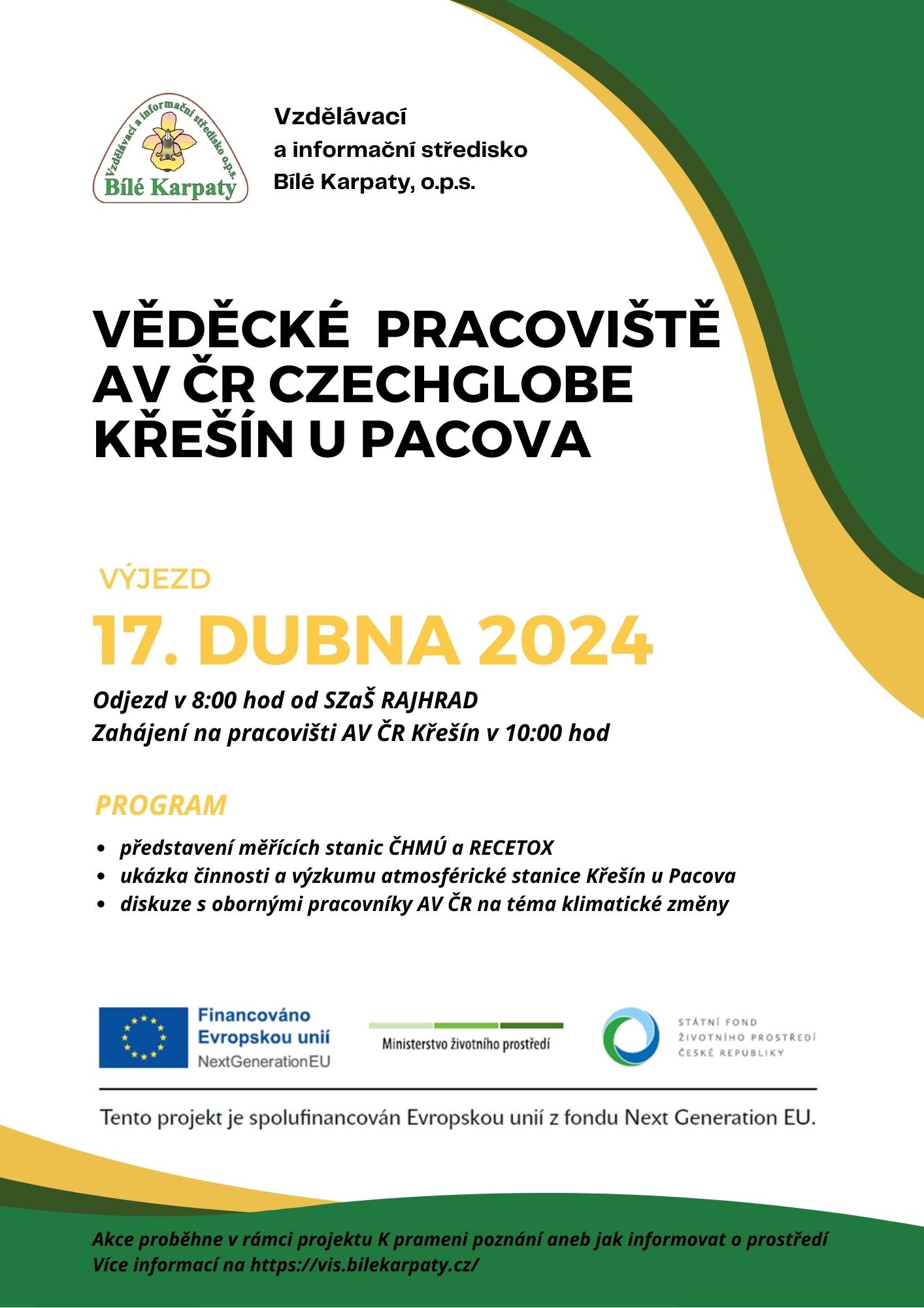 Ve spolupráci s Akademií věd České republiky pořádáme výjezd na vědecké pracoviště Akademie věd v Křešíně u Pacova. Vzhledem k omezenému počtu míst je potřeba se na akci přihlásit na email stockova@bilekarpaty.cz. Doprava vlastní.